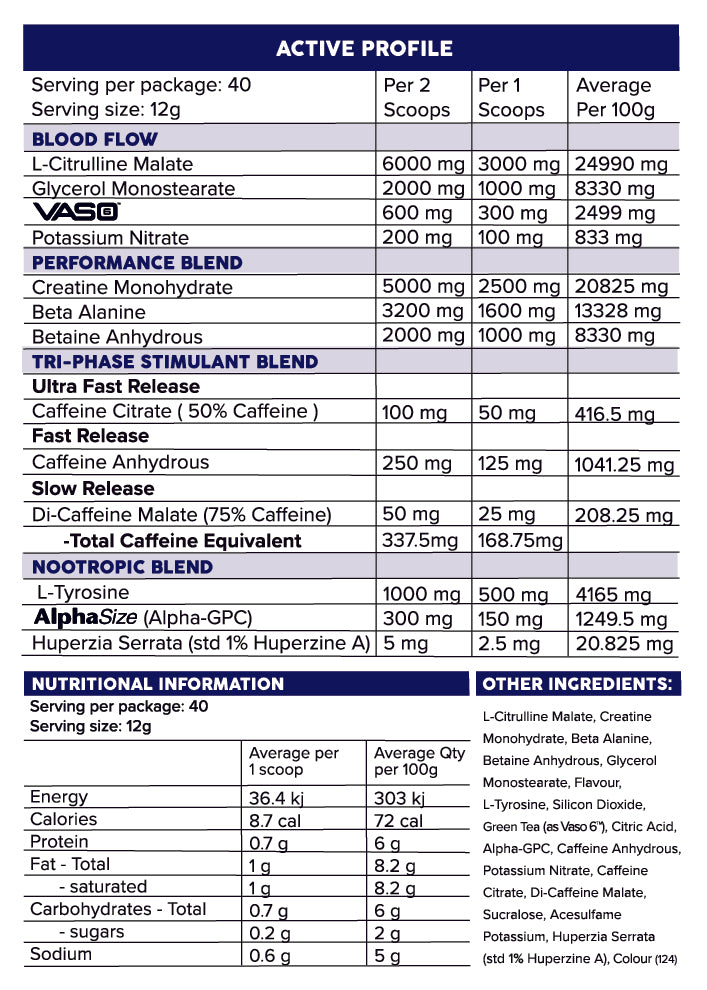 - Triple Phase Stimulant Blend: Combines fast-acting, sustained-release, and long-lasting stimulants for explosive energy that lasts without a crash.